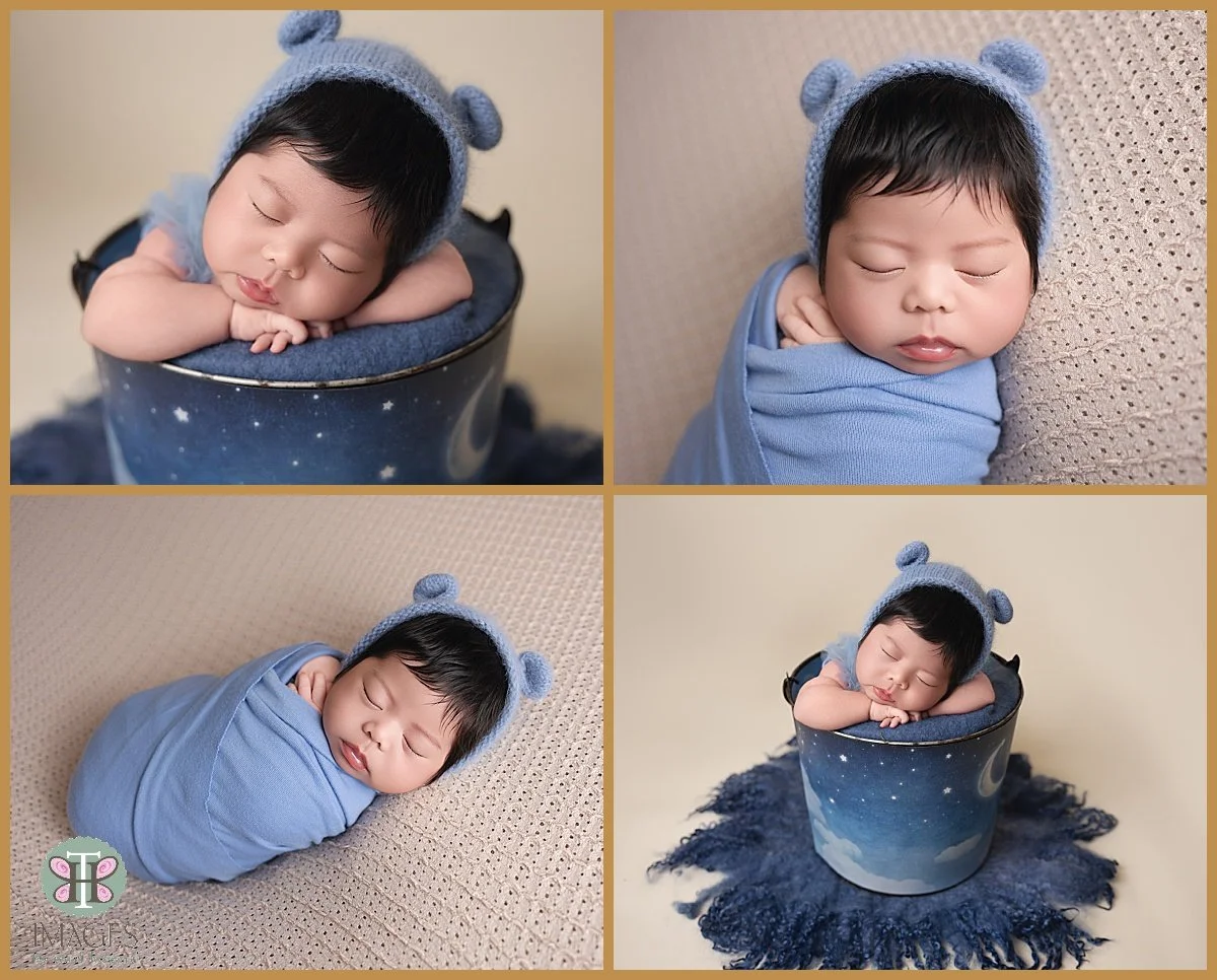 He arrived at the studio with his proud parents and two older brothers, who were so gentle and excited to snuggle their new baby sibling. There’s something incredibly special about photographing the bond between siblings, and these three boys already share such a strong and loving connection. The soft palette of blues, greens, and warm browns added a timeless and earthy feel to the images, perfectly complementing the joy and calm of the session.