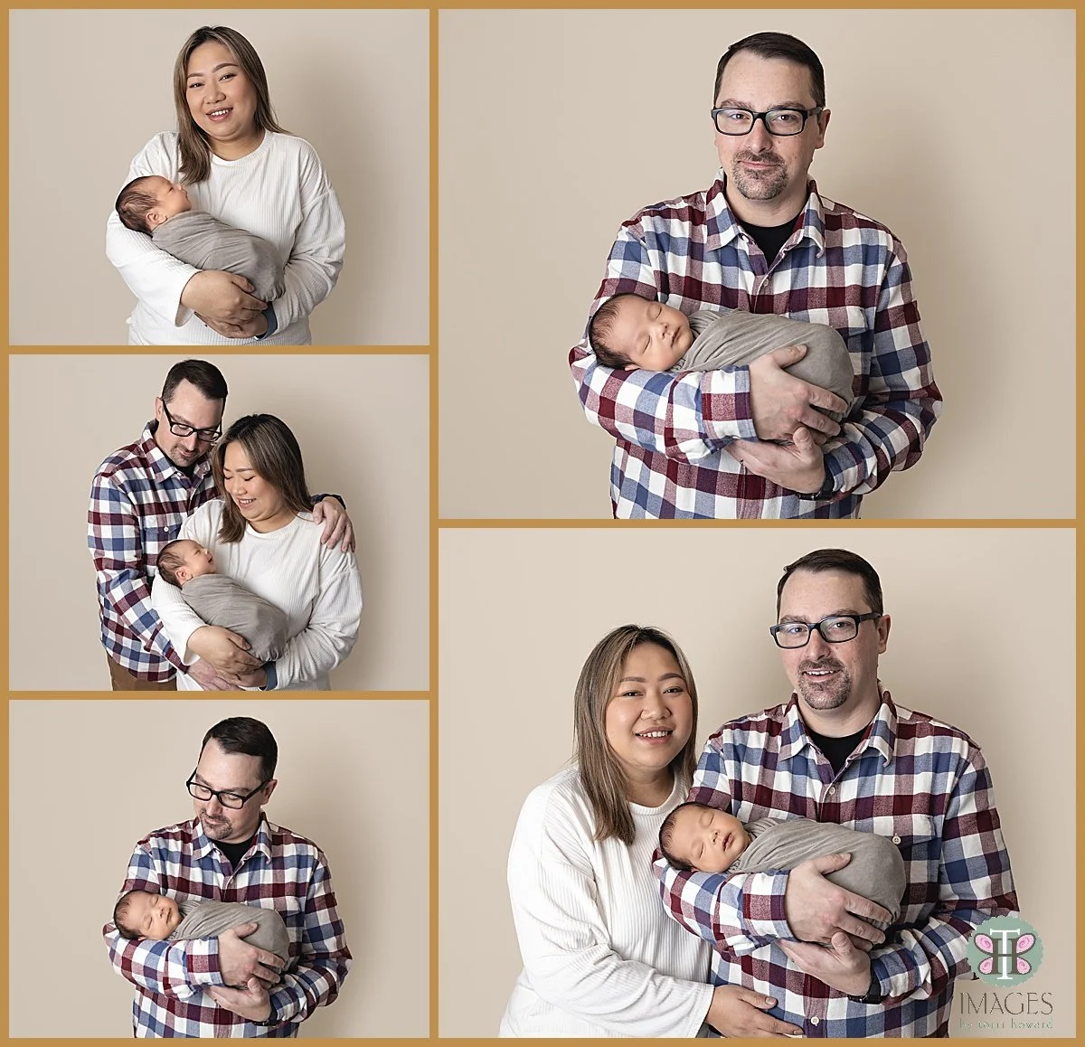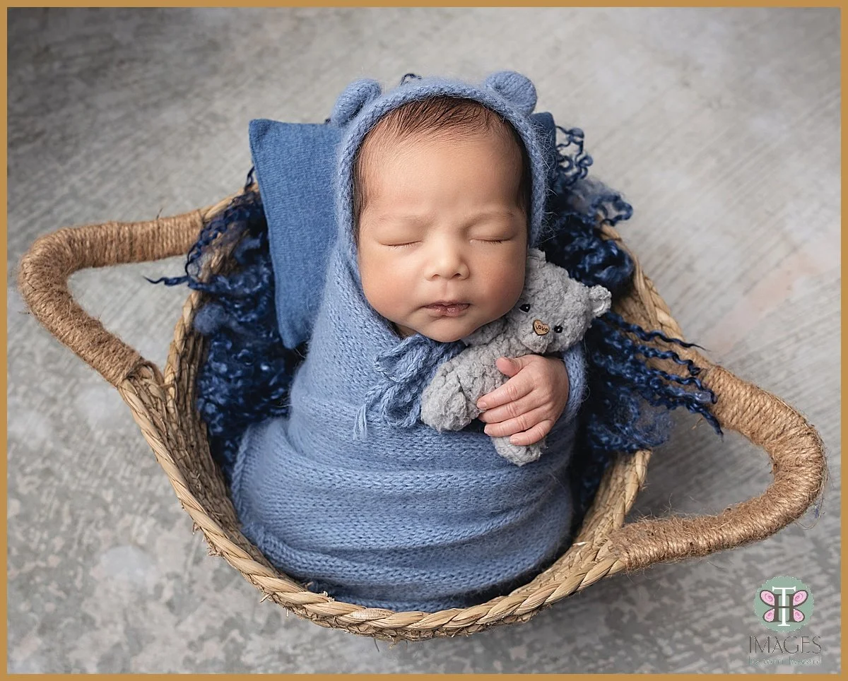 He arrived at the studio with his proud parents and two older brothers, who were so gentle and excited to snuggle their new baby sibling. There’s something incredibly special about photographing the bond between siblings, and these three boys already share such a strong and loving connection. The soft palette of blues, greens, and warm browns added a timeless and earthy feel to the images, perfectly complementing the joy and calm of the session.